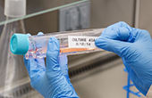 Mano guantata che estrae una fiala da una scatola