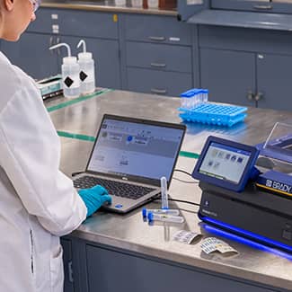 Chimico che utilizza una J7300 per stampare etichette per materiali pericolosi.